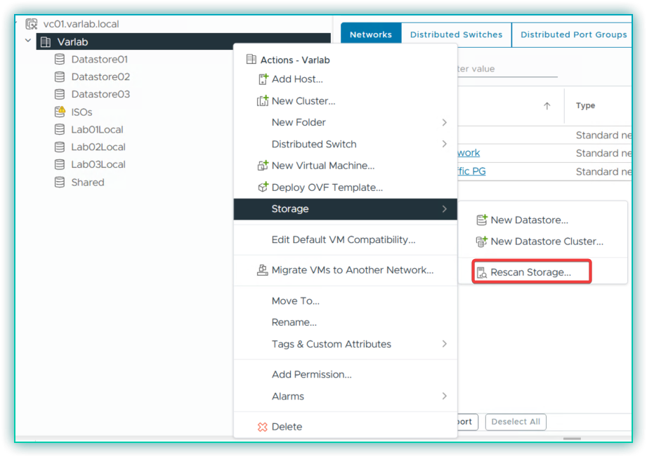 In the vCenter inventory, right-click the datacenter or cluster object, expand Storage, and select Rescan Storage.