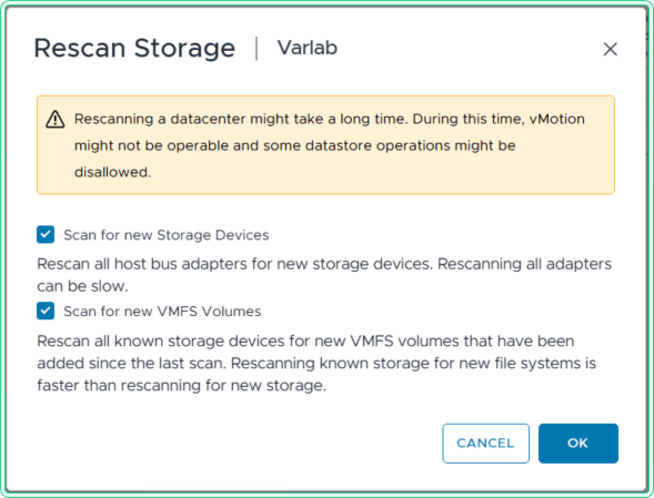 - Scan for new VMFS Volumes — scans for VMFS datastores on already-known devices. Use this when a device is already visible but a new VMFS volume has been created on it, or after a datastore was resignatured or removed.