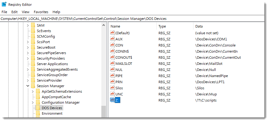 HKEY_LOCAL_MACHINE\SYSTEM\CurrentControlSet\Control\Session Manager\DOS Devices